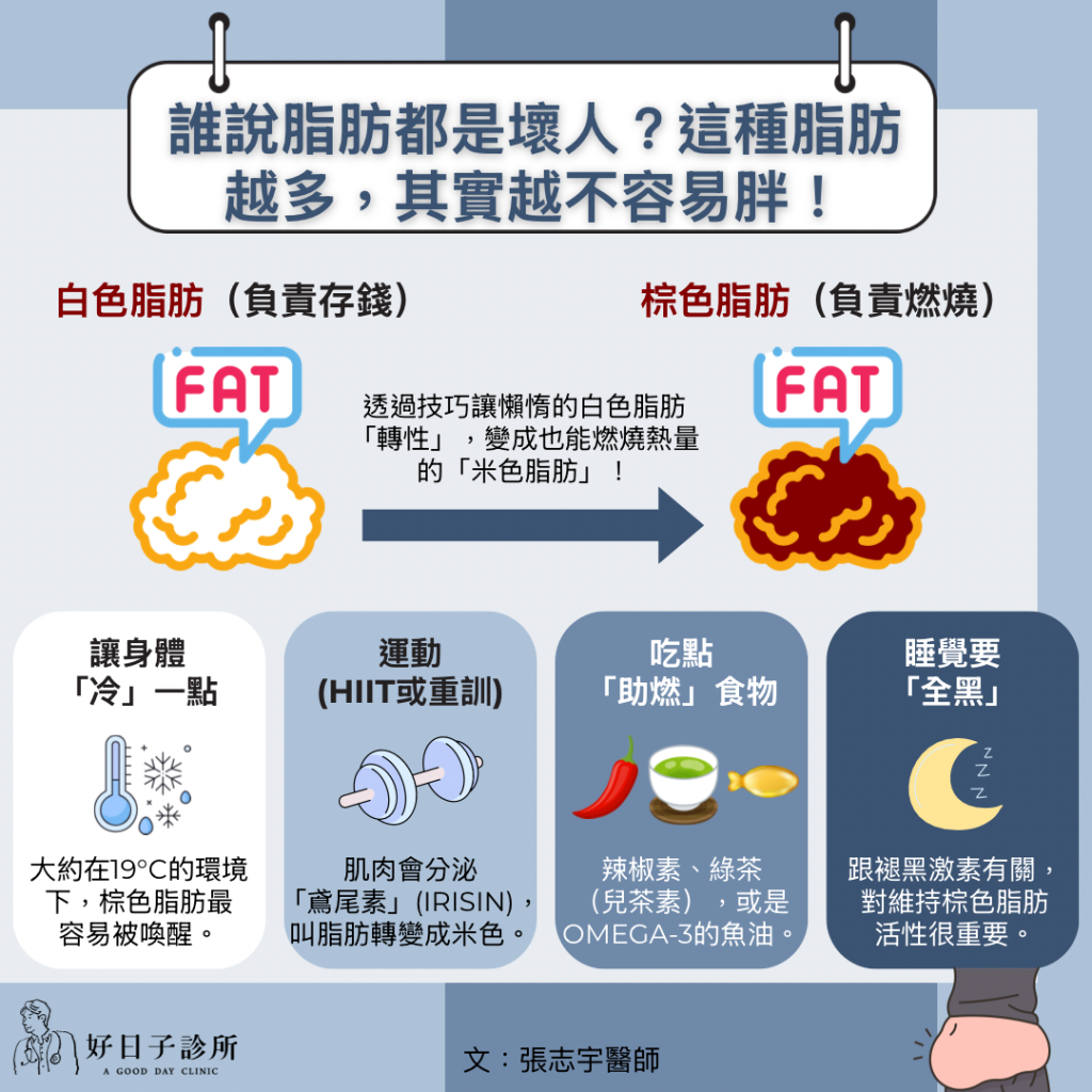 雖然成年人體內的棕色脂肪不多,但好消息是,我們可以透過技巧讓懶惰的白色脂肪「轉性」,變成也能燃燒熱量的**「米色脂肪」**!