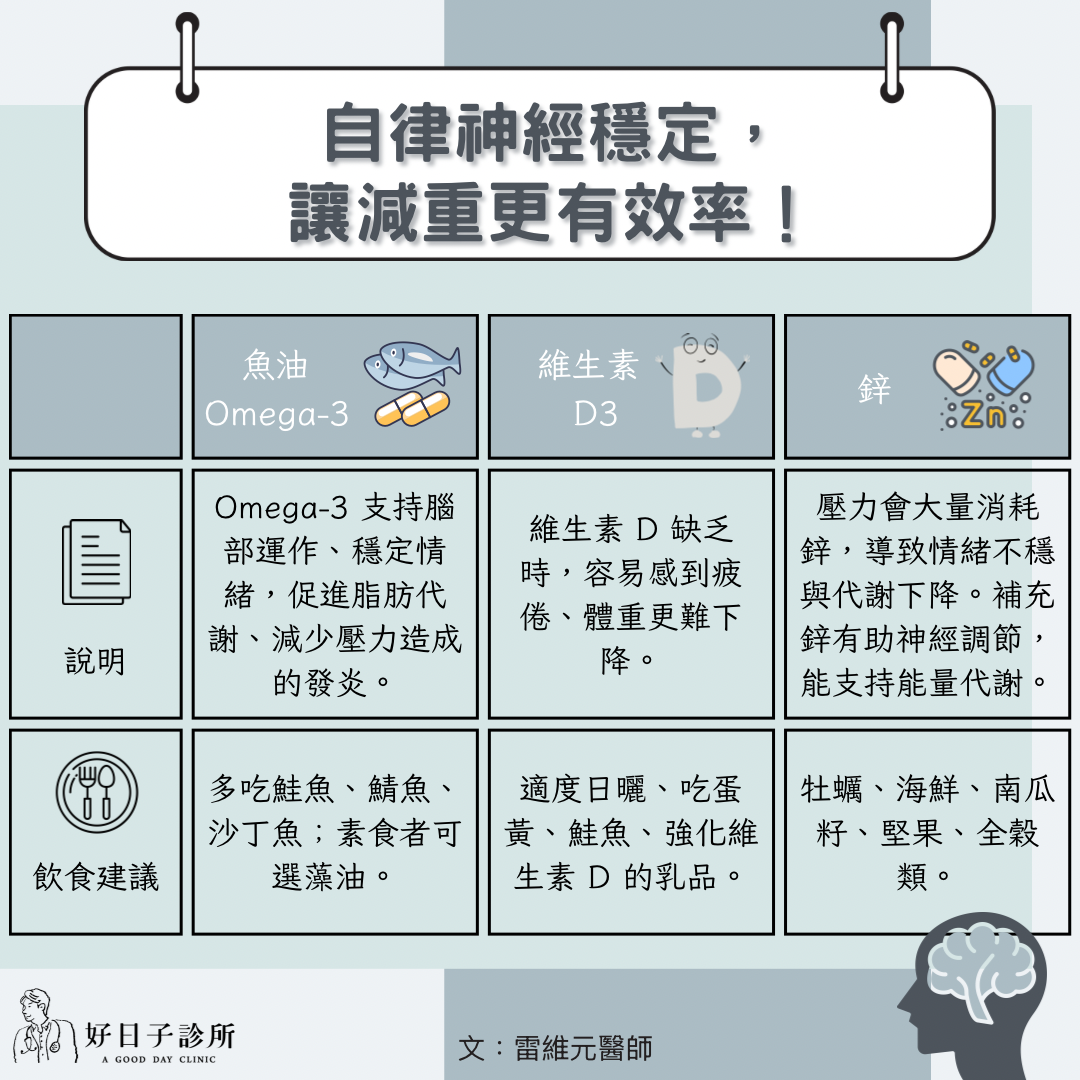 記住:自律神經穩定,是身體願意「燃脂」的第一步。 補充足夠的營養素,可以有效穩定自律神經,讓減重更有效率喔!