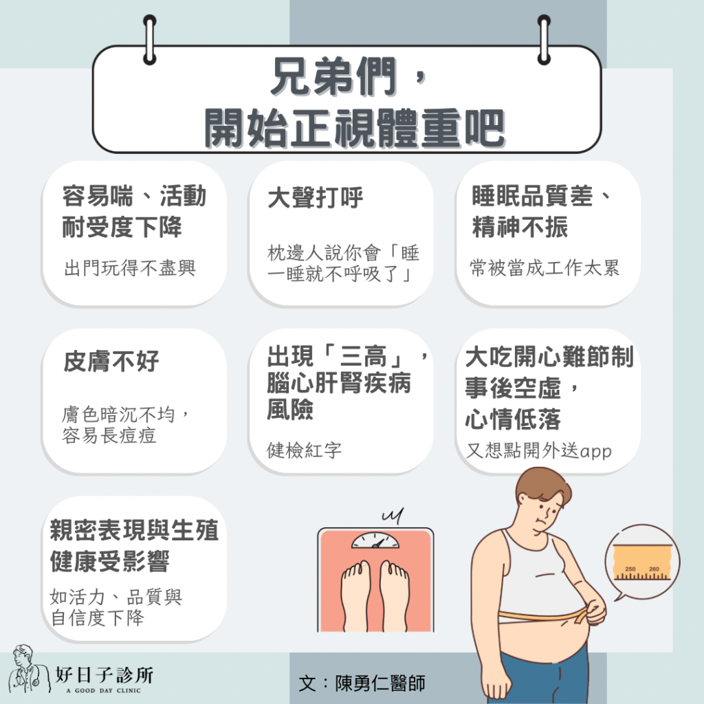 如果我們真的不在意身形與外觀,還有什麼訊號提醒自己不能再這樣胖下去?以下列出幾項外表之外、與健康密切相關的徵兆,給男士們參考