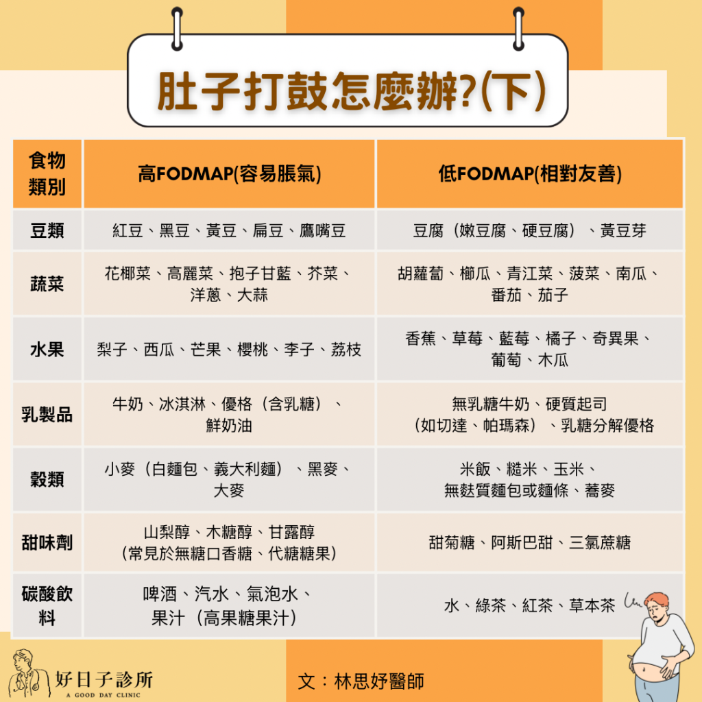 食物類別 | 高FODMAP(容易脹氣)| 低FODMAP(相對友善)
