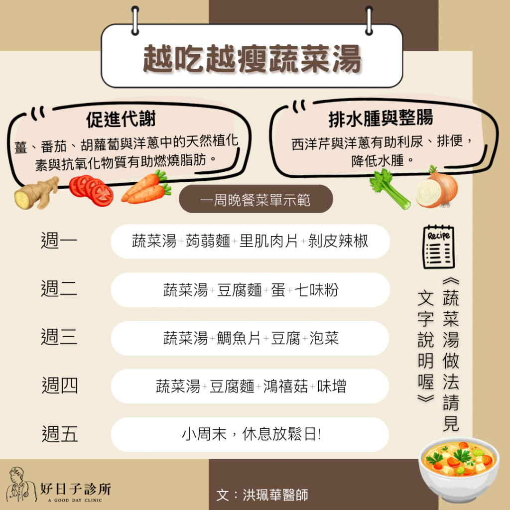 減重時一定要吃飽,洪醫師分享在家常備的好喝蔬菜湯底,讓你飽足感UP,還能越吃越瘦。重點是,這些食材,動動手指點全聯小時達或ubereat,都可以買到。假日睡飽後,把一個星期的晚餐湯底預備起來,下班回家後5分鐘就有健康又飽足的一餐。