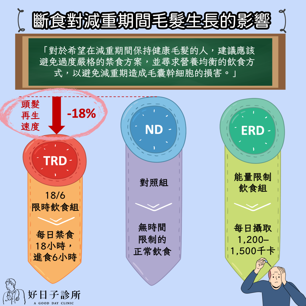 研究發現,斷食會導致遊離脂肪酸增加,釋放至毛囊環境中時,這些脂肪酸會增加氧化壓力引發毛囊細胞凋亡。