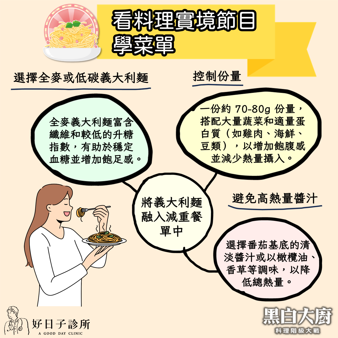 以節目中的橄欖油香蒜義大利麵為例,簡單的食材如橄欖油、大蒜、辣椒及少量起司調味,提供健康豐富的多酚、並富含抗氧化物和健康的單元不飽和脂肪酸,再搭配清炒蔬菜或沙拉,以及一份蛋白質(如烤雞胸肉或烤魚片)。