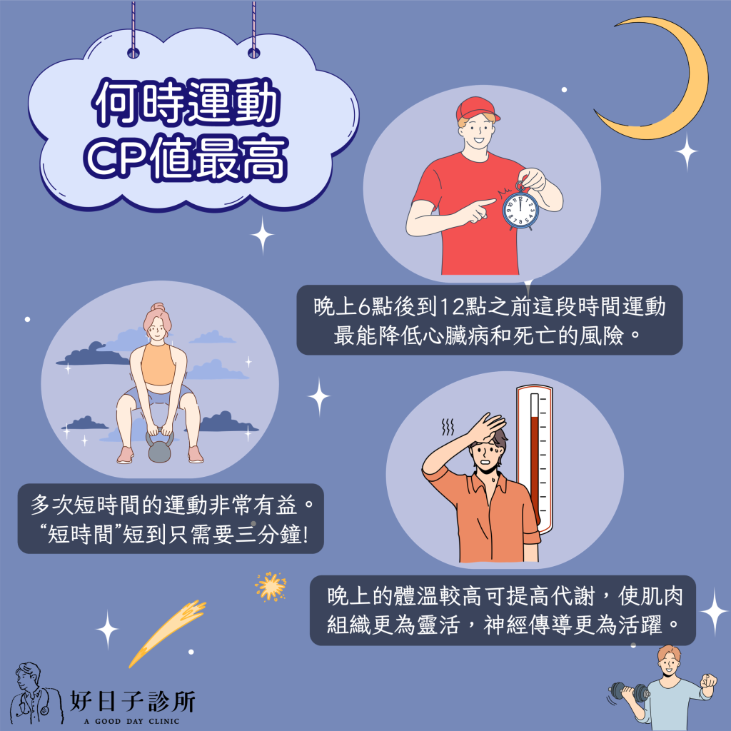 雖然晚間似乎是一個CP值比較高的運動時間,但其實相對於完全不運動的人,規則的運動,無論時間點,都可以降低心血管疾病的風險。