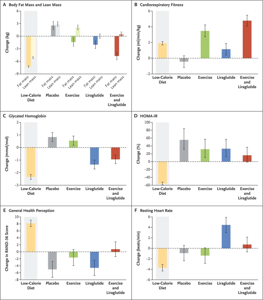 經過一年後,相較於控制組的體重,單純運動組下降了4.1kg,單純藥物組下降了6.8kg,而運動+藥物組下降了9.5kg。