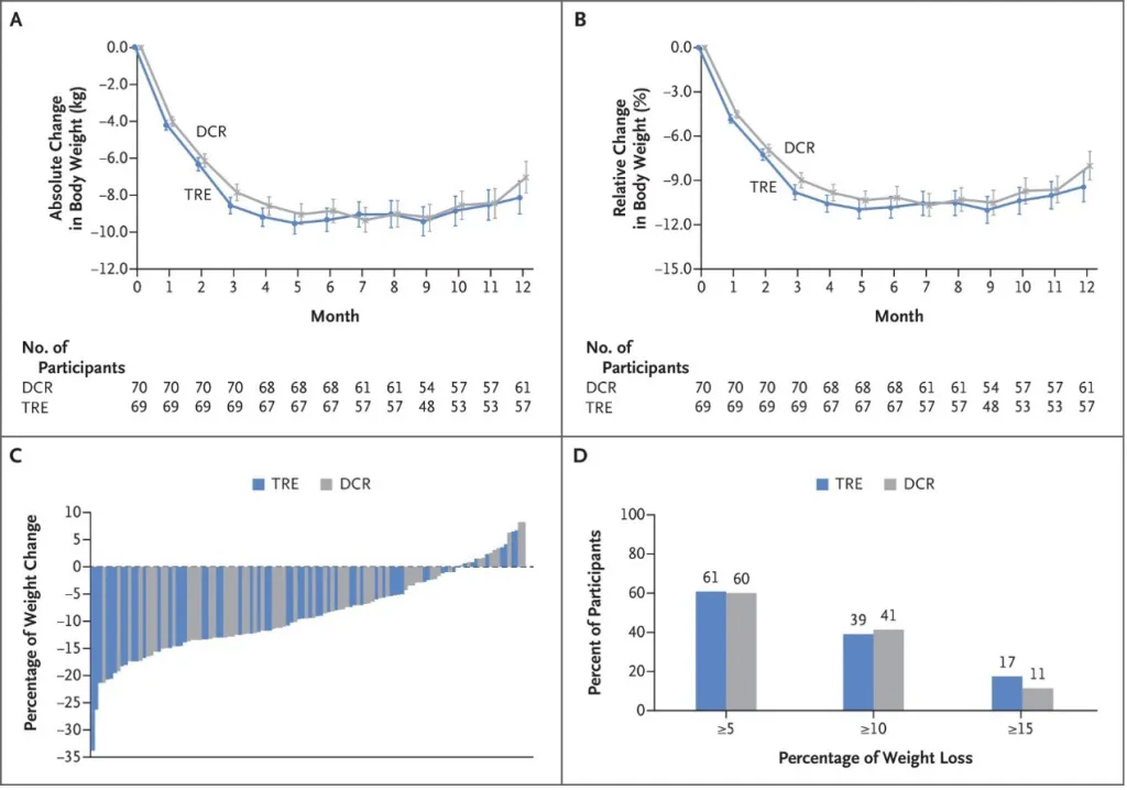 這篇的研究結果顯示,間歇性斷食組於一年後體重下降了8公斤,一般熱量限制組下降了6.3公斤,但兩者並沒有統計學上顯著的差異。