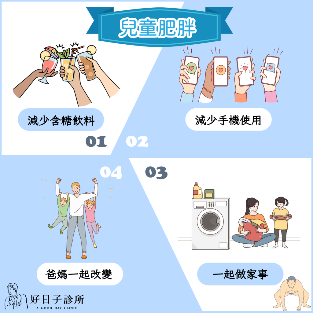 最重要的是「減少手機的使用」,因為手機普及,有些家長會用「手機育兒」,讓小朋友看平板、玩手機,長時間使用3C產品,導致活動量大幅下降,肥胖因而越來越盛行。