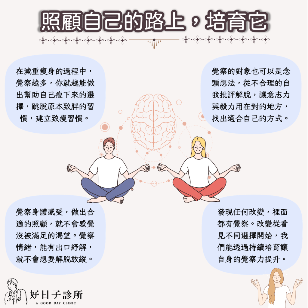 減重不僅僅是照顧自己的身體,也要照顧到自己的心裡,覺察自己身體感受的變化,究竟是餓、口渴還是疲倦等?做出合適的照顧方式,就不會老是感覺身體有某種沒被滿足的渴望。