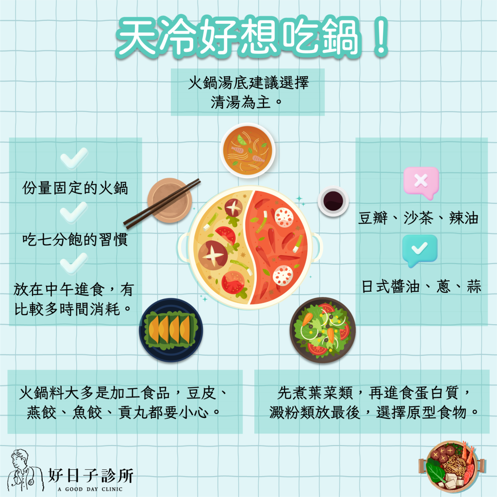 建議選擇份量固定的火鍋,養成吃七分飽的習慣,也可以把這餐放在中午進食,有比較多的時間可以去消耗。