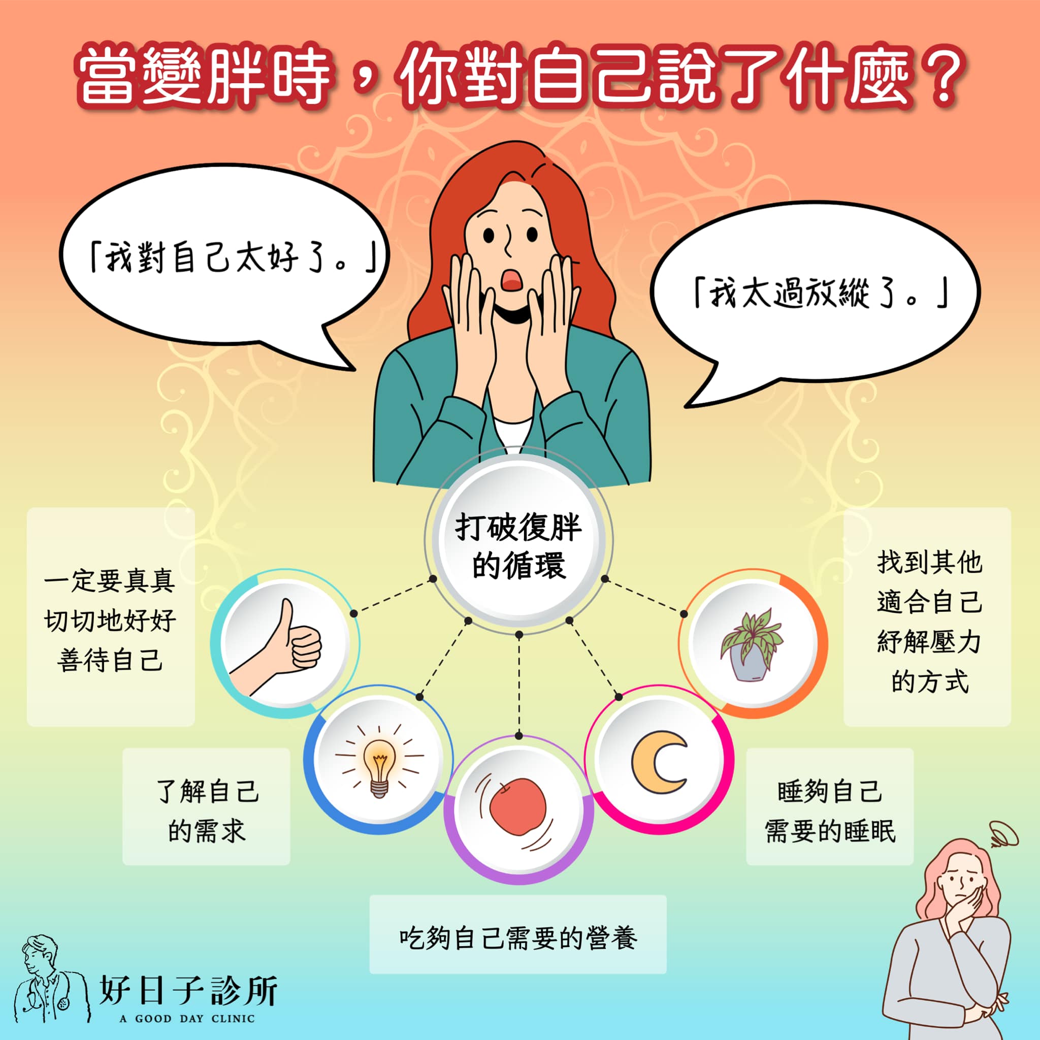 要打破復胖的循環,一定要真真切切地好好善待自己,了解自己的需求,吃夠自己需要的營養,睡夠自己需要的睡眠,找到其他適合自己紓解壓力的方式,你會體驗到,你需要的是放鬆不會是放縱,而且你絕對值得對自己真的太好。