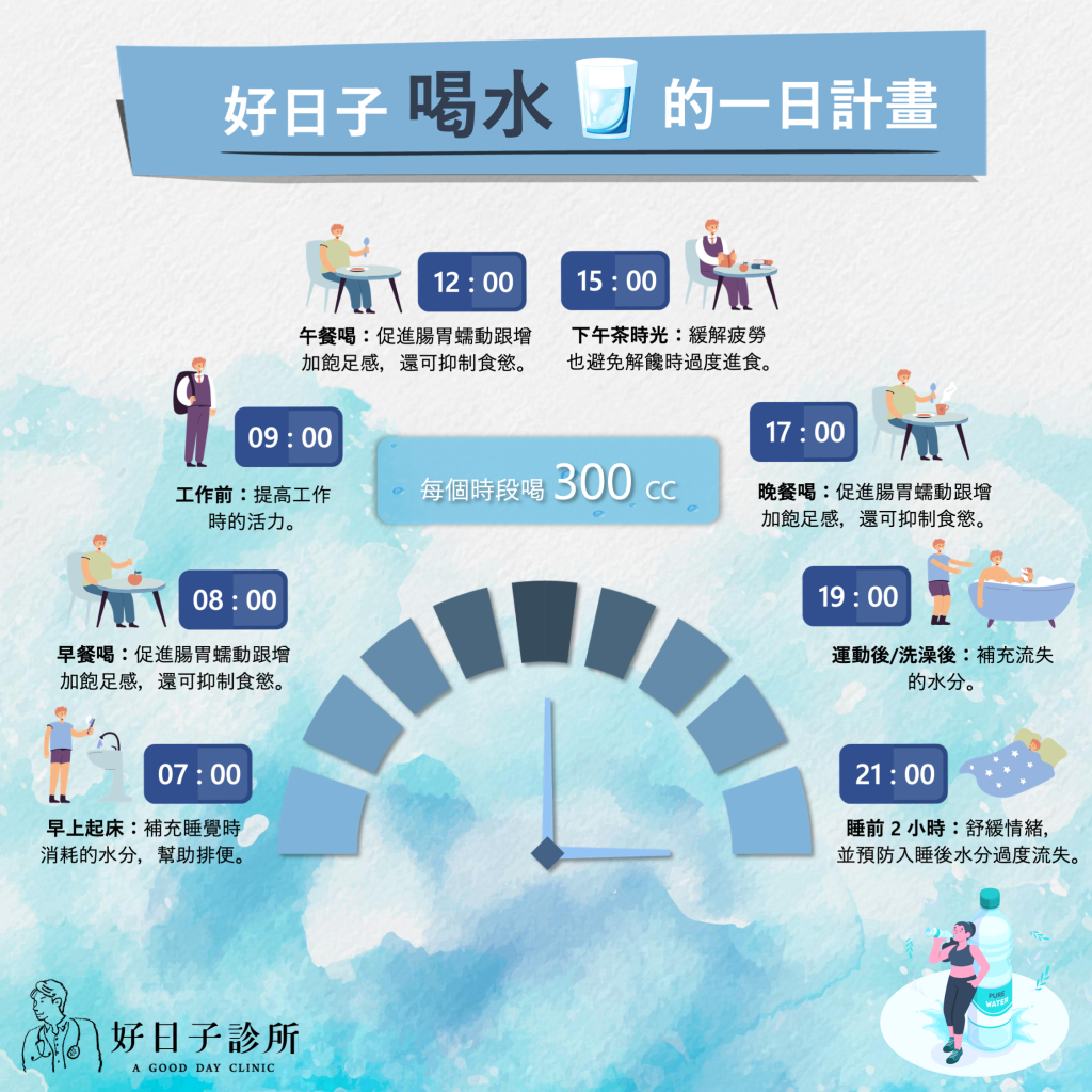 有時太忙容易忘記喝水,我們可以幫自己設定喝水的一日計畫,按表操課就能輕鬆累積足夠水分。