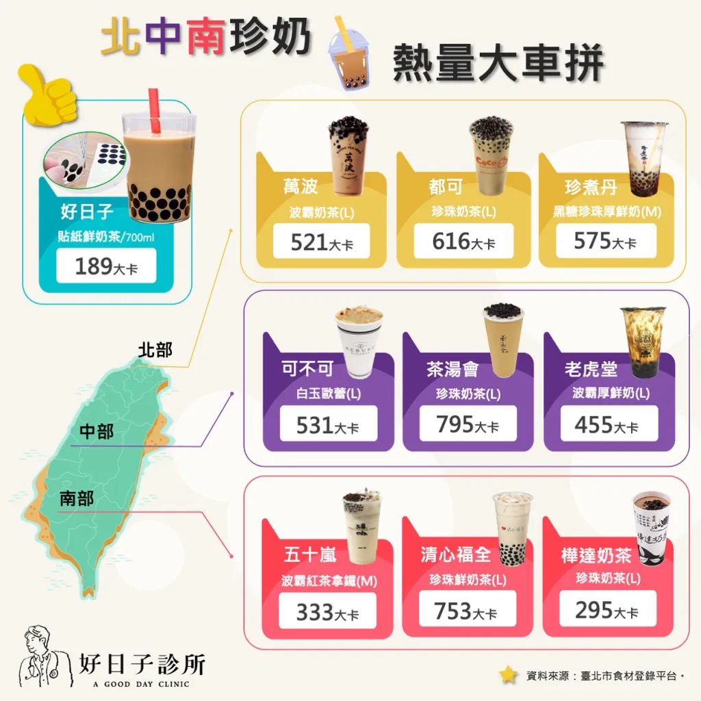 以減重觀點來看,圖表中列出的經典飲料「珍珠奶茶」,一杯的熱量大約在700大卡左右,將近一個炸排骨便當!為了健康考量,儘量少喝喔!
