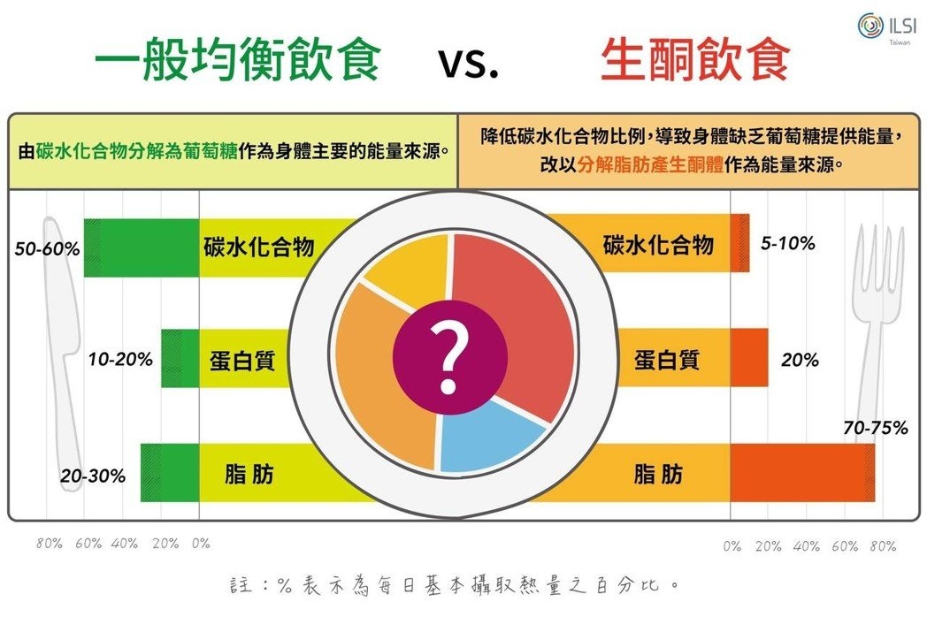 生酮飲食主張由脂肪提供每日約70-75%的熱量、蛋白質提供約20%、醣類則提供約5-10%,建議每日攝取的醣類要低於50公克。